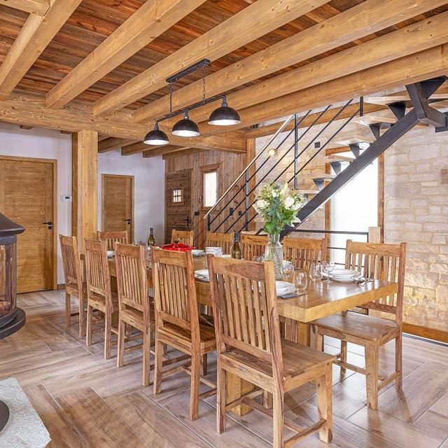 Het chalet is gebouwd in traditionele stijl met veel hout en een moderne afwerking. Binnen ruik je het hout, hoor je het knisperen van de open haard en kijk je uit op besneeuwde bergtoppen. De vijf slaapkamers zijn comfortabel ingericht en verdeeld over meerdere verdiepingen, ideaal voor samen reizen maar toch genoeg privacy. Met drie badkamers en twee aparte toiletten start iedereen ontspannen aan de skidag.